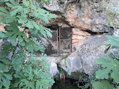 Regresamos a nuestra senda y continuamos por ella durante unos 115 metros para llegar hasta el punto marcado como Derecha senda 1, en donde nos desviaremos por nuestra derecha y tras recorrer unos 130 metros llegaremos a la Fuente de Fraga. Esta fuente se encuentra en una cavidad cerrada con un puerta de malla metálica y junto a ella encontraremos una mesa de madera con banco bancos.